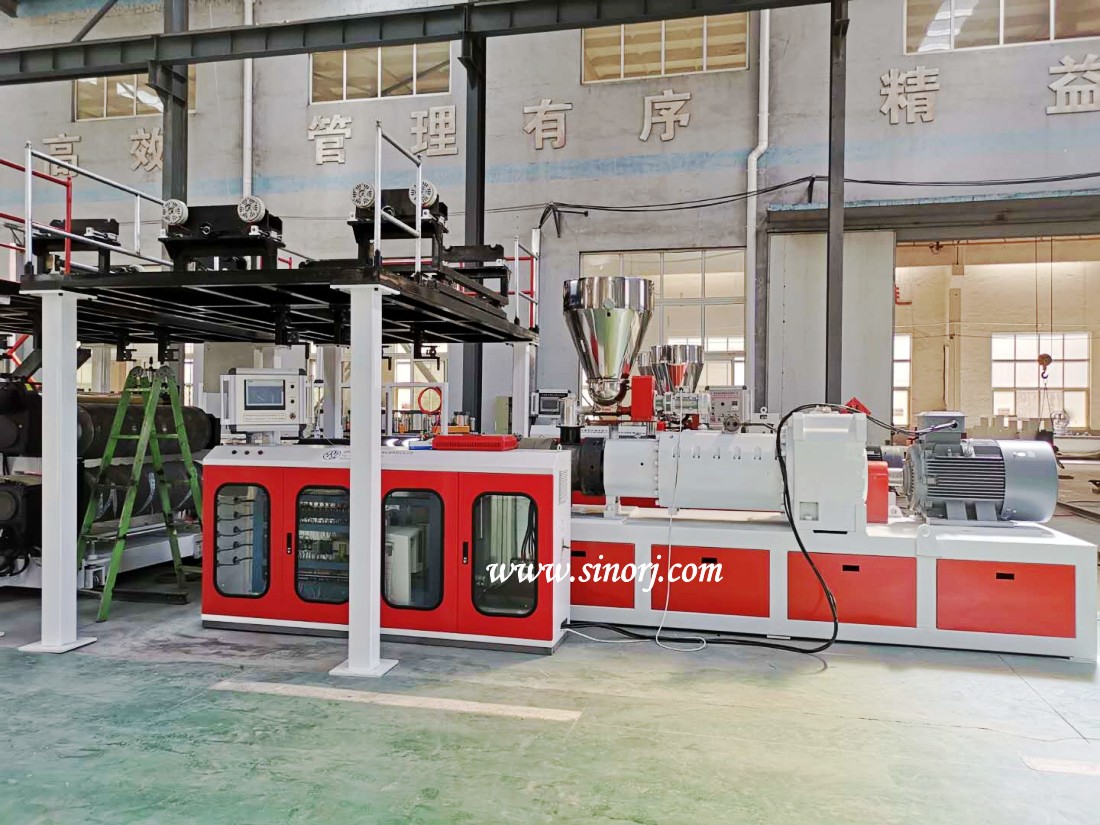 形成原理:直接將彩膜,耐磨層覆到擠出的板材上,SPC地板設(shè)備,并壓出防滑紋